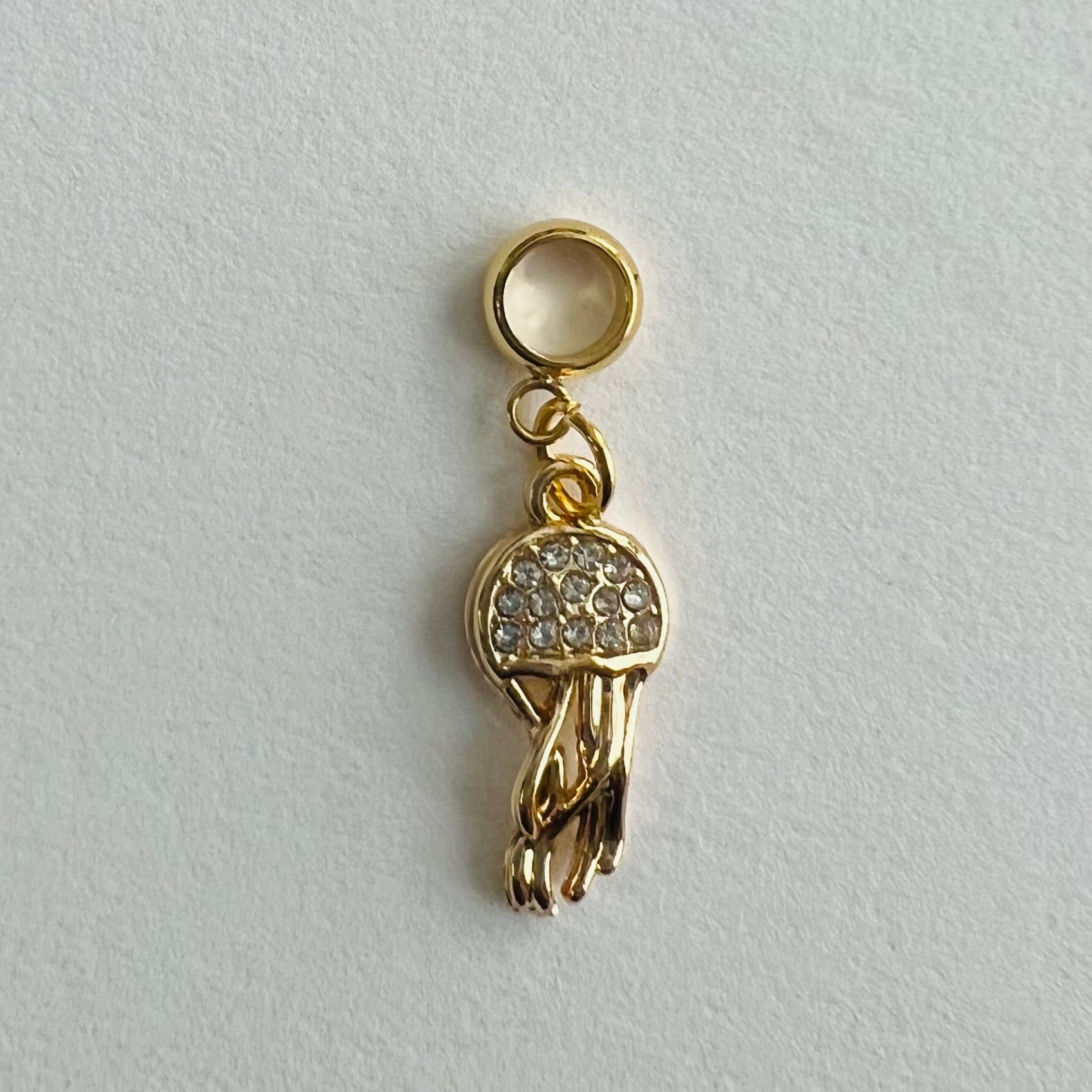 Personalize your charm bracelet with this gold, jellyfish micro-pavé dangle charm. The charm comes fully assembled with a high-quality, tarnish-free, stainless steel gold bail (charm holder) for easy addition to your bracelet. Just slide the charm right on to your bracelet! No need to struggle with jump rings trying to put your charm on your bracelet.